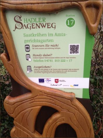 Jetzt werden die Krähen nicht mehr vergrämt, nein, es werden sogar mit Hilfe von EU-Steuermitteln liebliche Schildchen aufgestellt,mit einer Telefon-hotline, mit Audio-Leihgeräten (schön teuer) und es wird ein QR-code aufgebracht, mit Hilfe dessen über ein Mobiltelefon nebst barcode-App ein Audio aufgerufen werden kann und sich der interessierte Tourist über die Vögelchen informieren kann.
