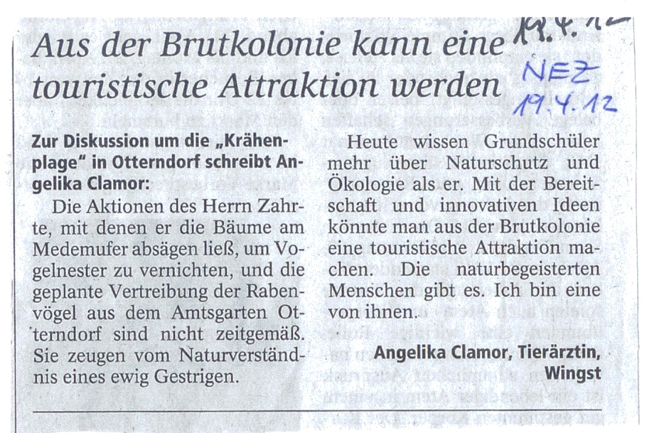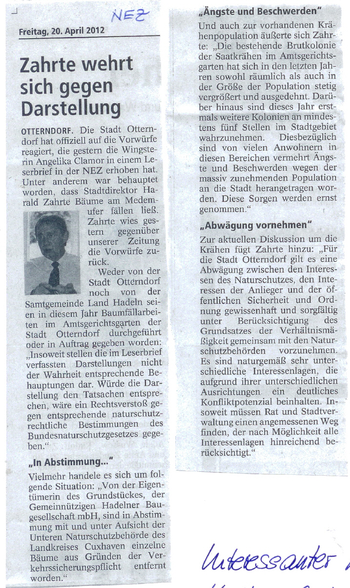 Ach ja, am 6. und 7. März 2012 wurden aus den Bäumen im Amtsgerichtsgarten und rund um den Speckenplatz von den insgesamt 105 Nestern der artgeschützten Saatkrähen 94 Nester entfernt und so versucht, den Saatkrähen die Lebensgrundlage zu entziehen - und zwar ohne Genehmigung des Naturschutzamtes des Landkreises Cuxhaven nach § 67 BNatSchG und gegen die explizite fachliche Empfehlung der Staatlichen Vogelschutzwarte, die diese Form der Vergrämung ohne angemessene und vor allem geeignete Ausgleichsmassnahme strikt ablehnt...........und wer war es ? Politiker jedenfalls nicht, denn die entfernen keine Nester.......