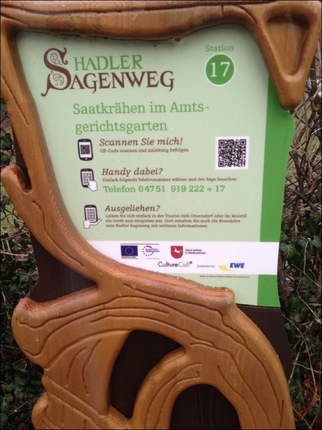 Jetzt werden die Krähen nicht mehr vergrämt, nein, es werden sogar mit Hilfe von EU-Steuermitteln liebliche Schildchen aufgestellt,mit einer Telefon-hotline, mit Audio-Leihgeräten (schön teuer) und es wird ein QR-code aufgebracht, mit Hilfe dessen über ein Mobiltelefon nebst barcode-App ein Audio aufgerufen werden kann und sich der interessierte Tourist über die Vögelchen informieren kann. Mein Gott, wie furchtbar fürsorglich das ganze plötzlich.